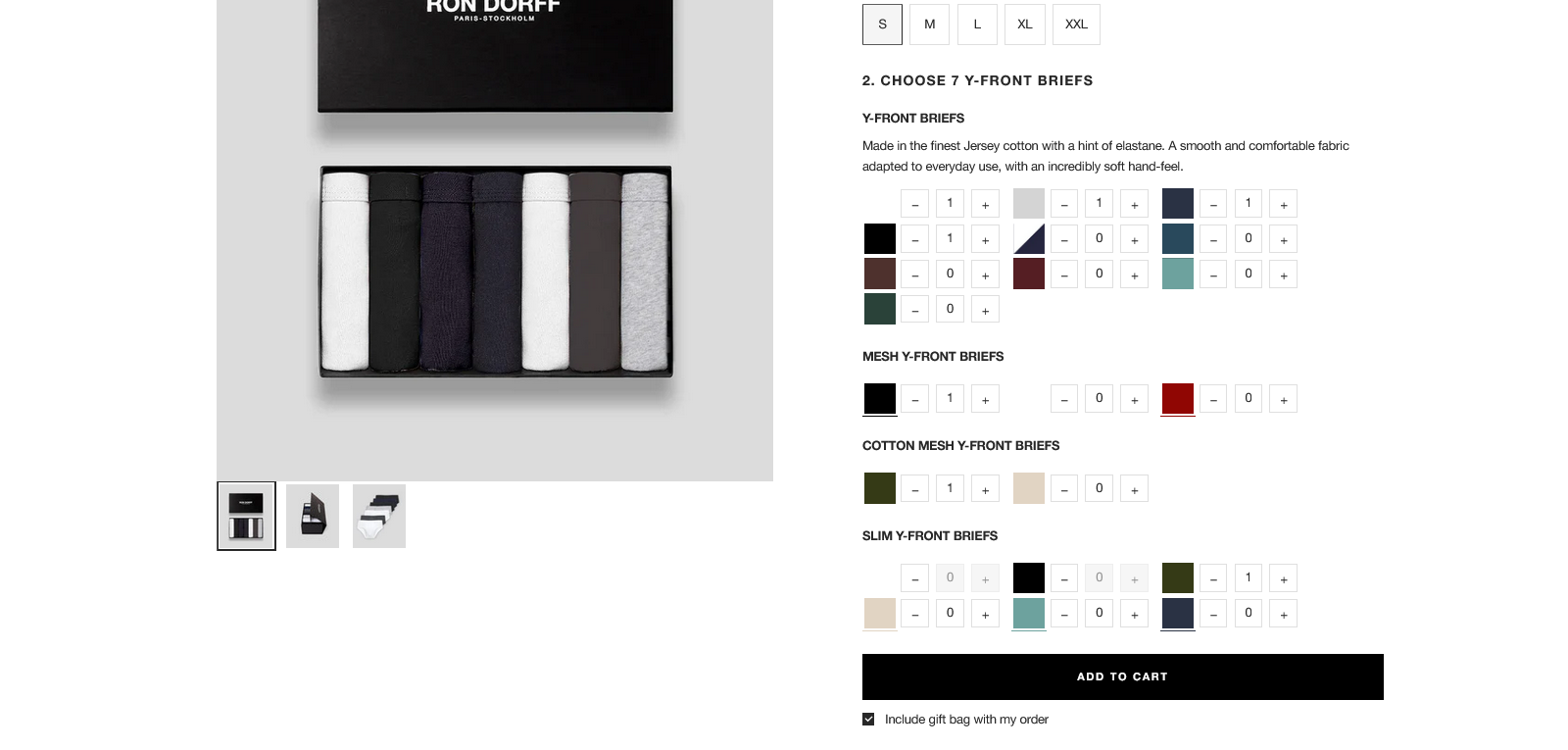 A bundle builder using a main product with a fixed price and component products added as line items, each product has it's own quantity selector, the button only becomes active when the total quantity is 7, then quantity selectors become inactive. Clicking each swatch shows a corresponding product images gallery.