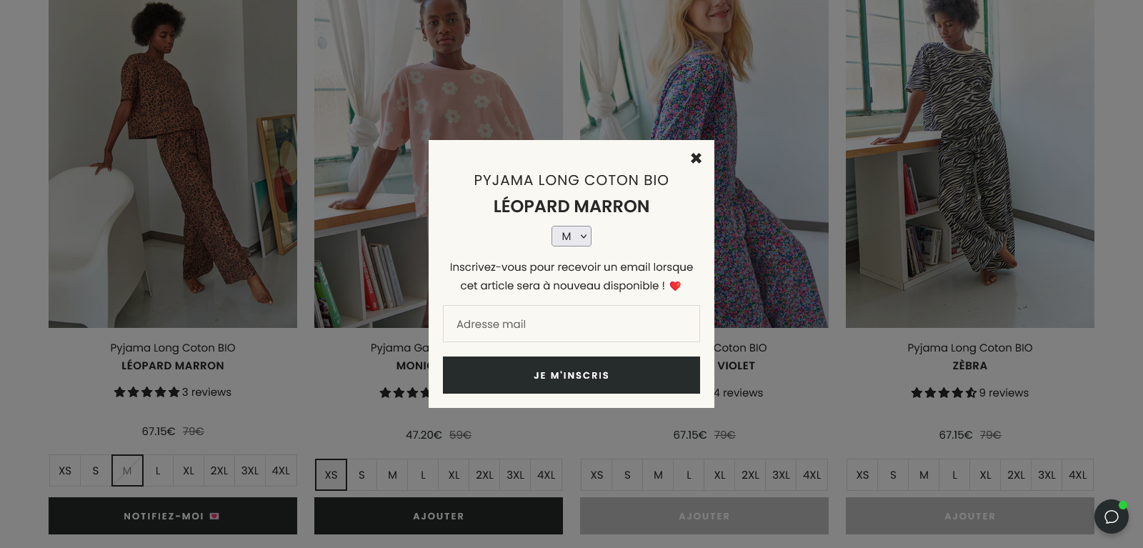 Created add to cart forms with variant selectors for collection grid products, the add to cart buttons are inactive until size is selected. If the size is sold out the button text changes to "Notify me" and opens a custom Klaviyo back in stock email capturing popup.
