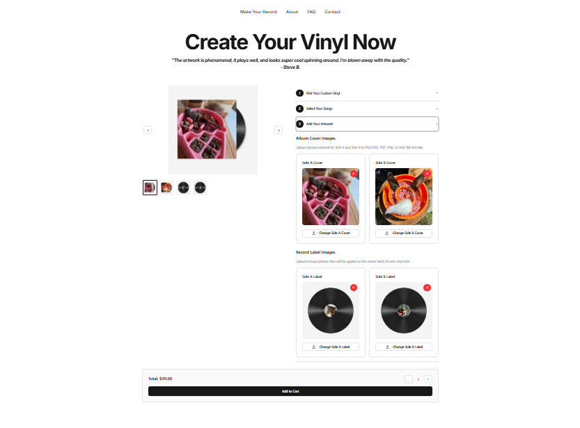 John wanted to launch a highly customized vinyl record business on Shopify, allowing customers to create personalized vinyl records by uploading artwork and audio files. something not supported by standard Shopify apps. In addition, orders needed to be automatically processed and fulfilled via Kunaki, a third-party vinyl manufacturer, without manual intervention.
